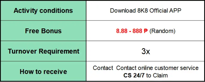 All new and old members of 8K8, as long as you download and install the official APP of 8K8 and bind the withdrawal account, you can apply for and receive a random free bonus of 8.88~888 ₱(random).
