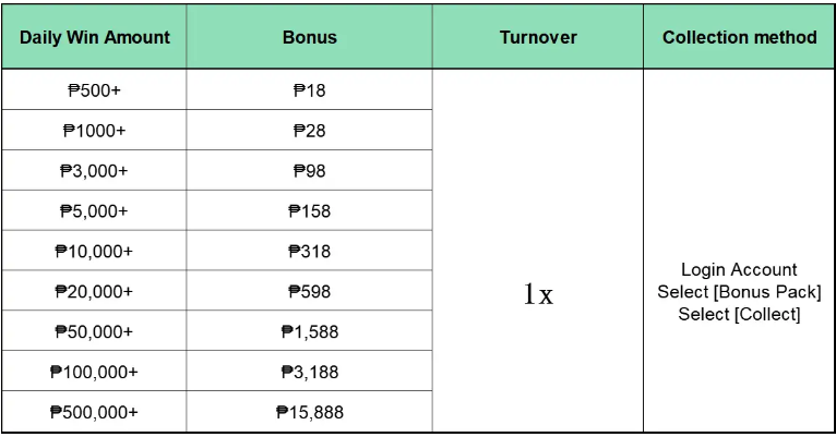 The system will automatically settle and transfer to each member’s account before 16:00 Philippine time every day. Members should log in to your account, click on [Bonus Pack], and then click on [Collect] to receive the bonus. The reward will expire at 13:00 Philippine time on the following day (e.g. the reward will be issued at 14:00 on August 3, and will expire at 13:00 on August 4.).